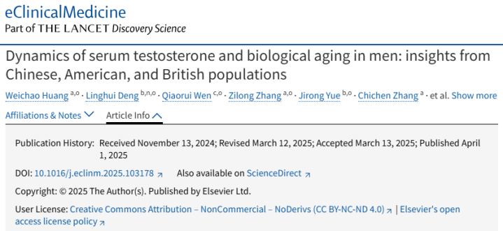 2025年,四川大学华西医院联合多国团队在《柳叶刀》子刊发表的研究指出,男性血清睾酮水平越高,生物年龄增长就越慢。该研究共对中美英三国的1.7万余名受试者进行了调查,通过调查受试者体内的睾酮水平,将他们分成4组。