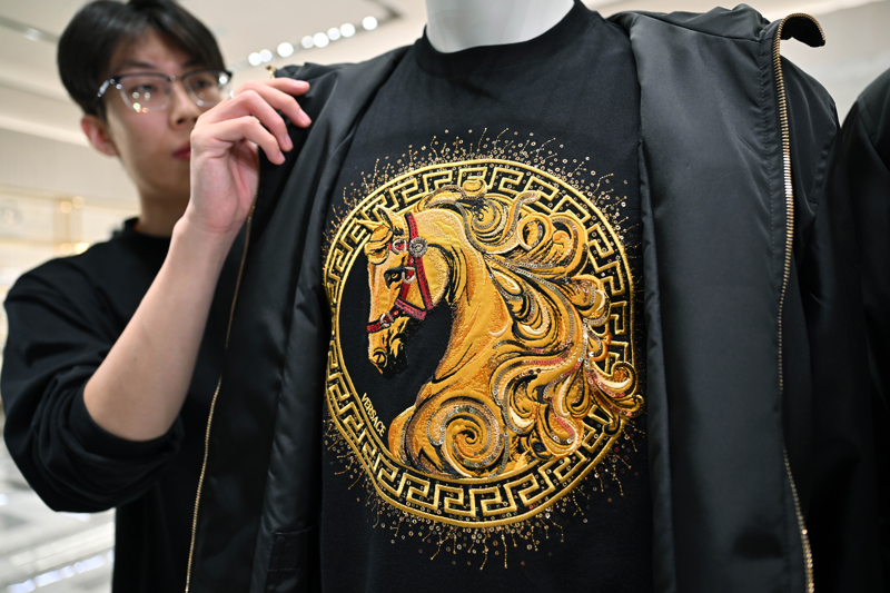 这是在海口国际免税城拍摄的马年主题服装(1月24日摄)。 农历丙午马年将至,不少国际品牌融入中国生肖文化和中国风元素,纷纷推出马年新春限定款,竞逐中国新春市场。 新华社记者 郭程 摄