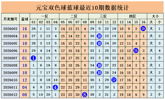 上期回顾:双色球第2026012期开出奖号:红球03、05、07、16、20、24;蓝球08,其中红球三区比为3:2:1,奇偶比3:3,蓝球开出小偶数号码08。