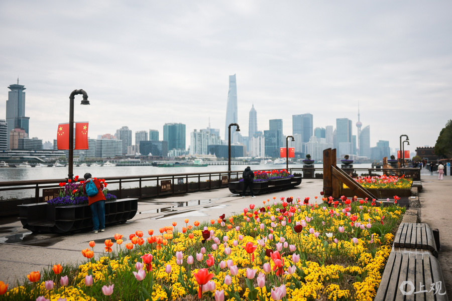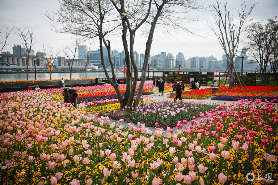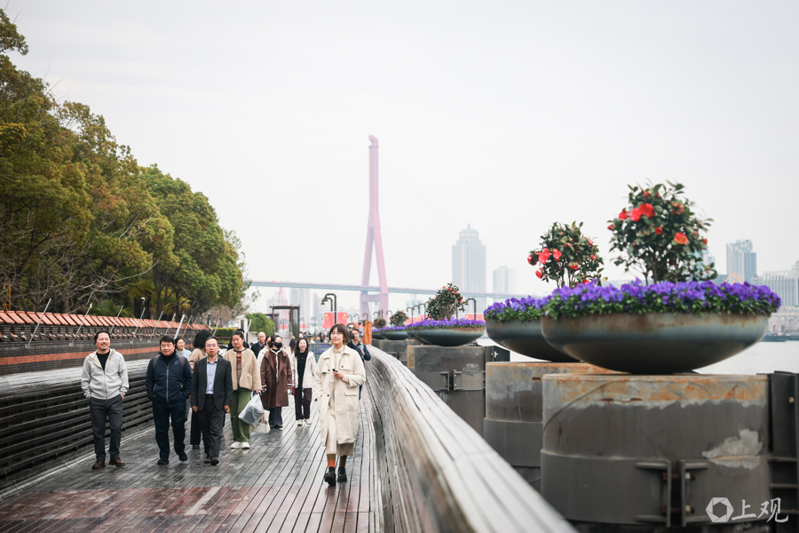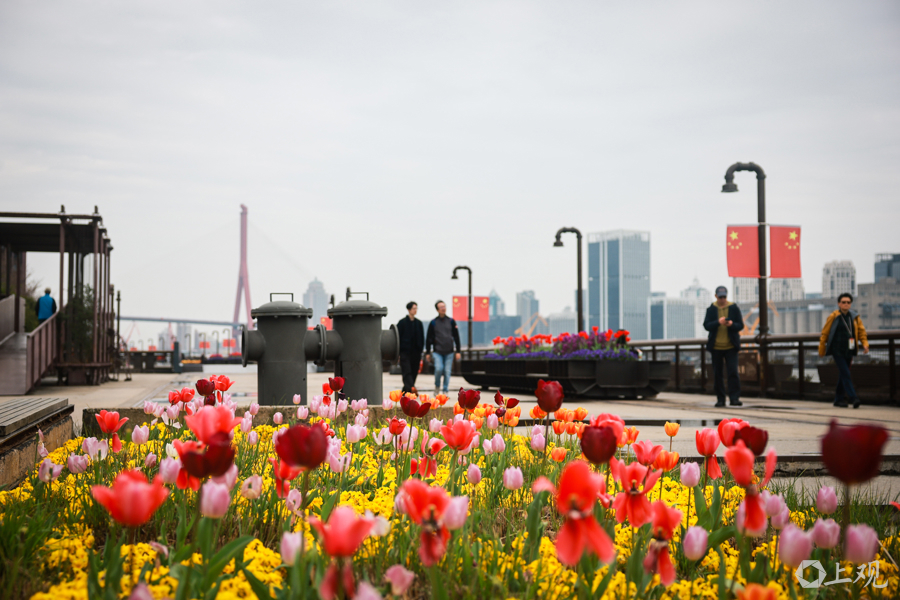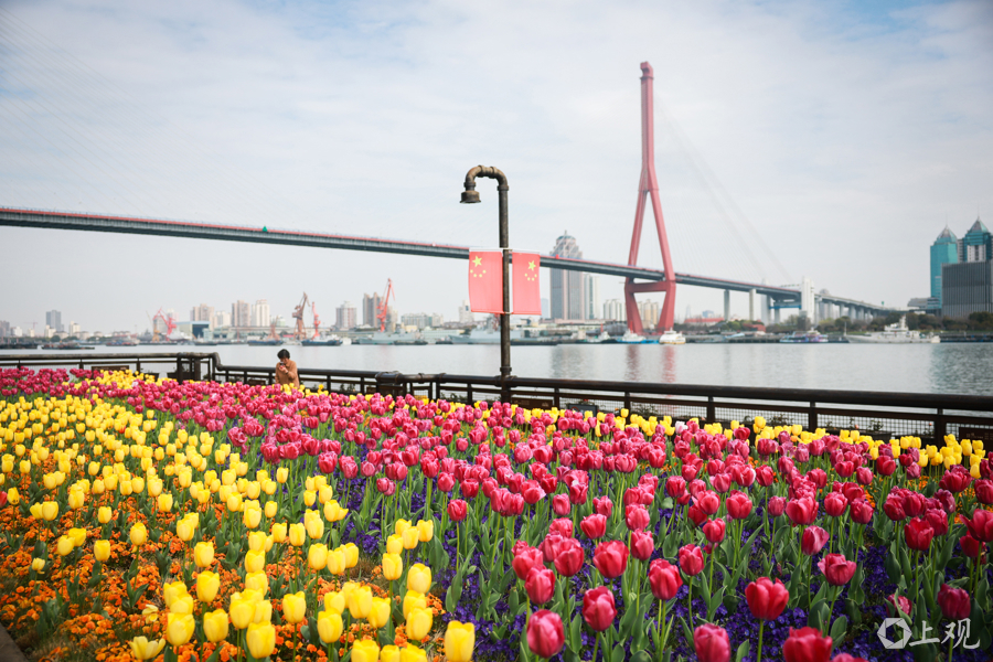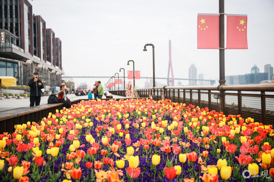 从杨浦大桥至东方渔东谈主船埠的沿江步谈被装点成一派春日花海。